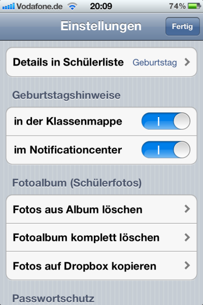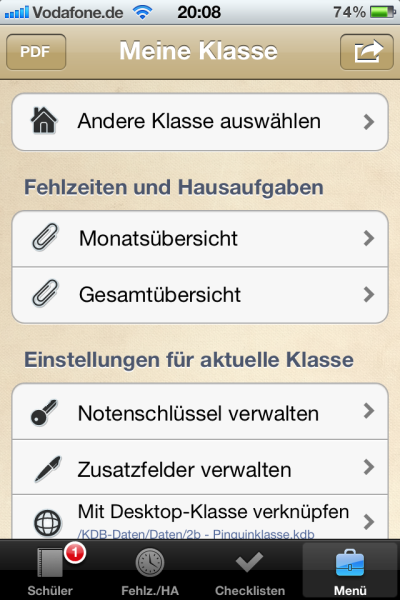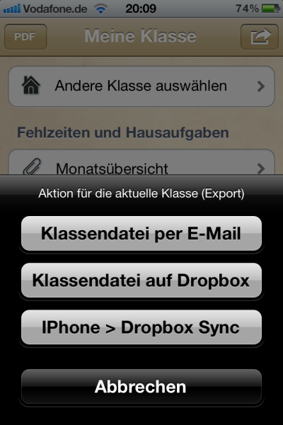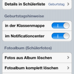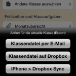 - Klassendaten (Schülerdaten, Checklisten, Einträge, …) lassen sich nun vom IPhone exportieren und wieder importieren (z.B. als Sicherheitsbackup oder Austausch mit Kollegen oder zwischen eigenen Geräten)