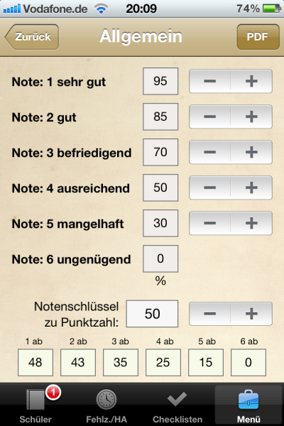 - verwalten und bearbeiten von Notenschlüssel für verschiedene Fächer: automatische Ausgabe einer Notenskala für jeweilige Punktzahlen