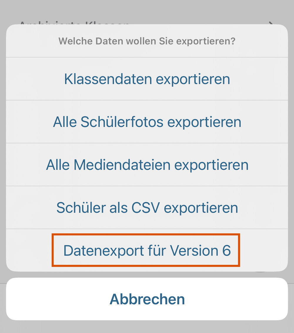 - Wählen Sie in der folgenden Übersicht die Option “Datenexport für Version 6”. Sollte diese Option nicht erscheinen, ist die neue Version der Klassenmappe noch nicht installiert oder wurde noch nicht gestartet. Bitte beachten Sie, dass auf Ihrem Gerät ausreichend freier Speicher zur Verfügung stehen muss, damit die Exportdatei erstellt werden kann.