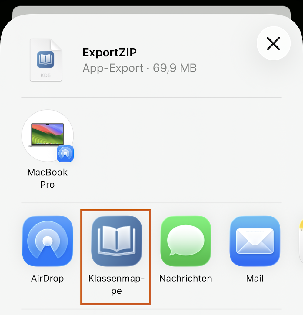 - Im folgenden “Teilen”-Bildschirm klicken Sie in der Zeile mit den App-Icons auf das Icon mit der Bezeichnung “Klassenmappe”. Anschließend öffnet sich die Klassenmappe v6 mit exakt den Daten aus Ihrer alten Klassenmappe.
